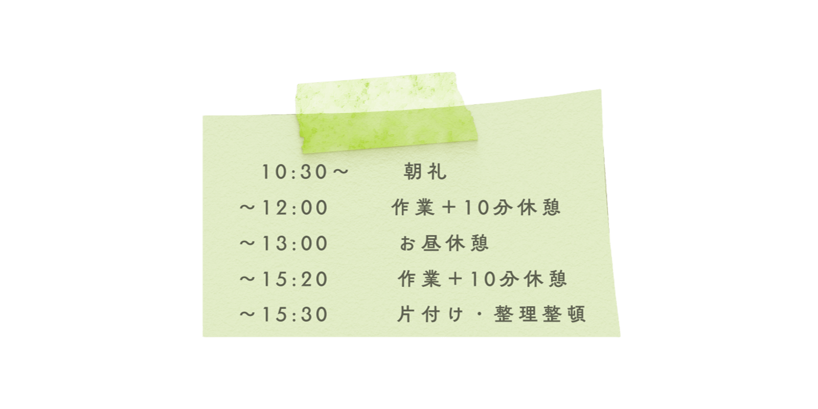 | サービス提供時間 | 月~金 午前10:30~午後15:30 【土・日・祝日休み】 |